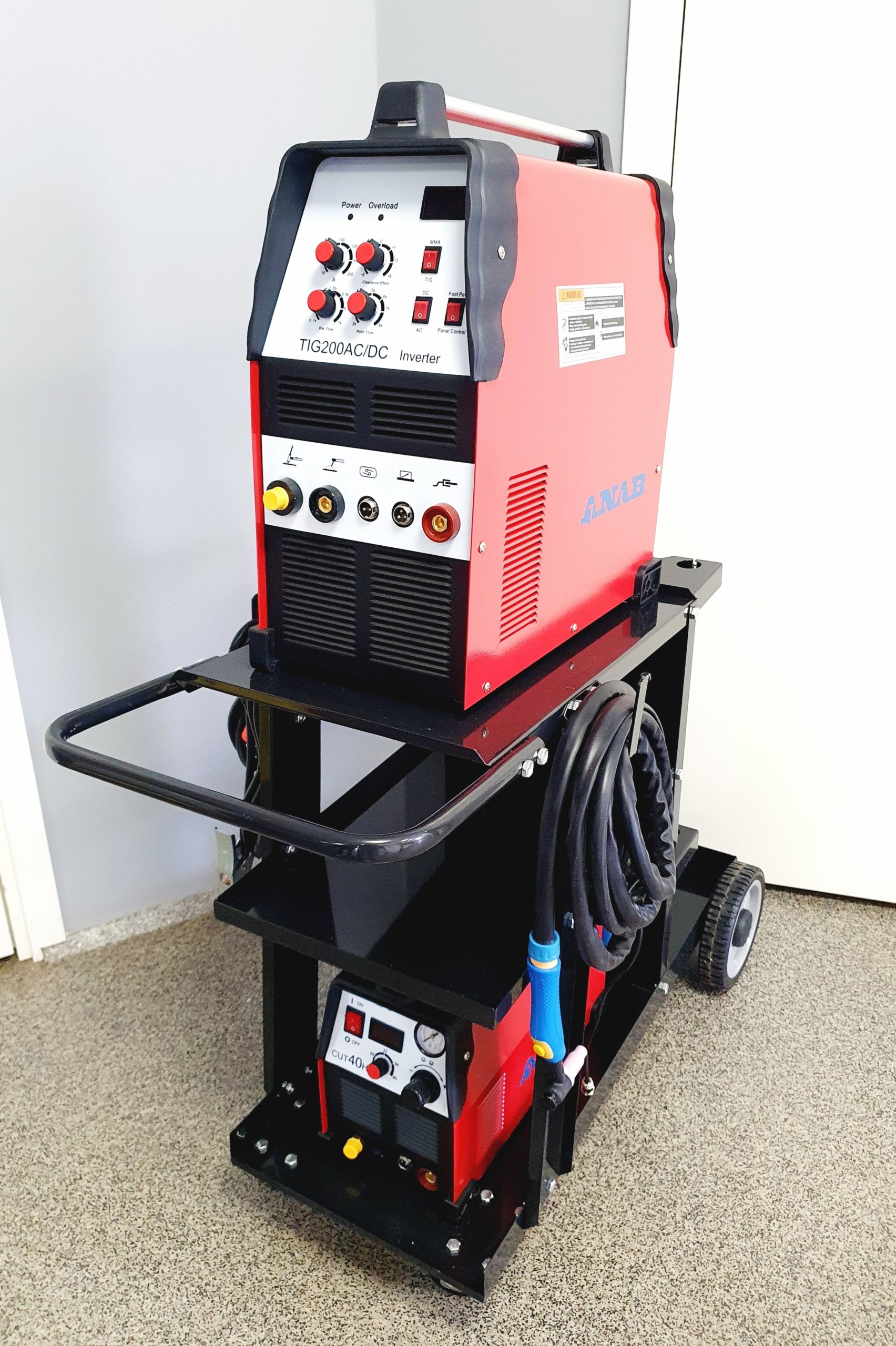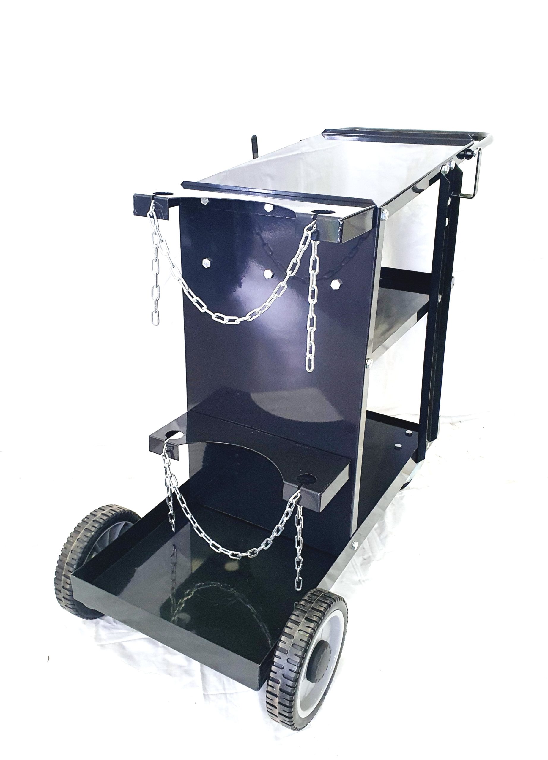 Svetsvagn med plats för gasflaska. Passar både tig-svetsar, mig-svetsar och mindre svetsar. Svartlackerad.